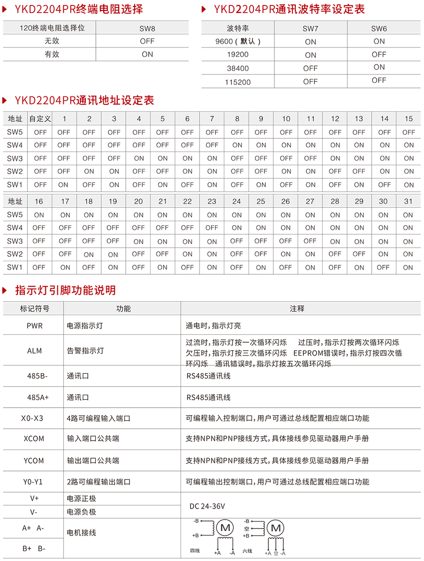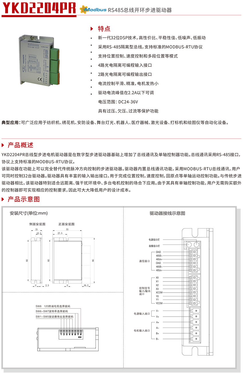 YKD2204PR總線型步進(jìn)電機(jī)驅(qū)動(dòng)器是在數(shù)字型步進(jìn)驅(qū)動(dòng)器基礎(chǔ)上增加了總線通訊及單軸控制器功能??偩€通訊采用RS-485接口,協(xié)議上支持標(biāo)準(zhǔn)的MODBUS-RTU協(xié)議。