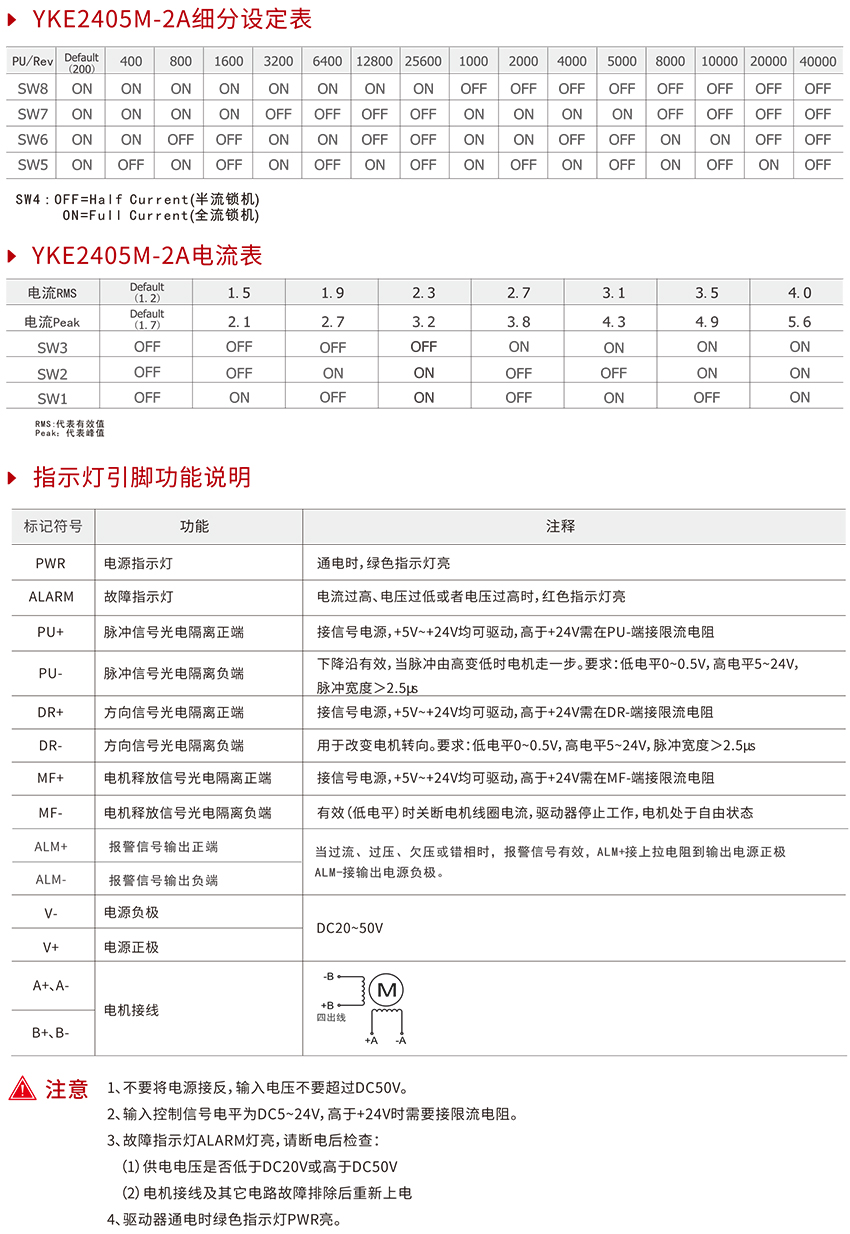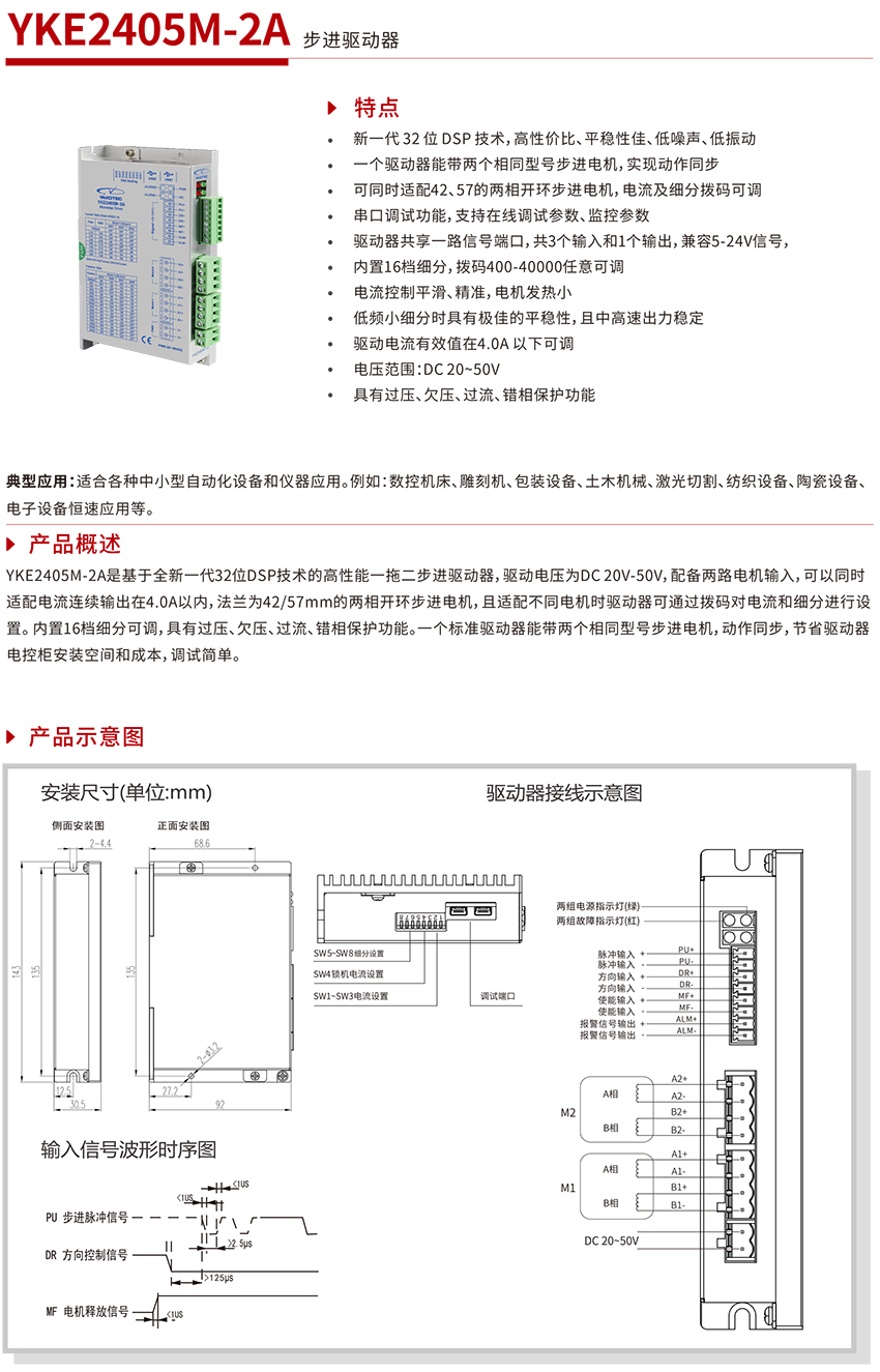 YKE2405M-2A是基于全新一代32位DSP技術(shù)的高性能一拖二步進驅(qū)動器,驅(qū)動電壓為DC 20V-50V,配備兩路電機輸入,可以同時適配電流連續(xù)輸出在4.0A以內(nèi),法蘭為42/57mm的兩相開環(huán)步進電機,且適配不同電機時驅(qū)動器可通過撥碼對電流和細(xì)分進行設(shè)置。 內(nèi)置16檔細(xì)分可調(diào),具有過壓、欠壓、過流、錯相保護功能。一個標(biāo)準(zhǔn)驅(qū)動器能帶兩個相同型號步進電機,動作同步,節(jié)省驅(qū)動器電控柜安裝空間和成本,調(diào)試簡單。