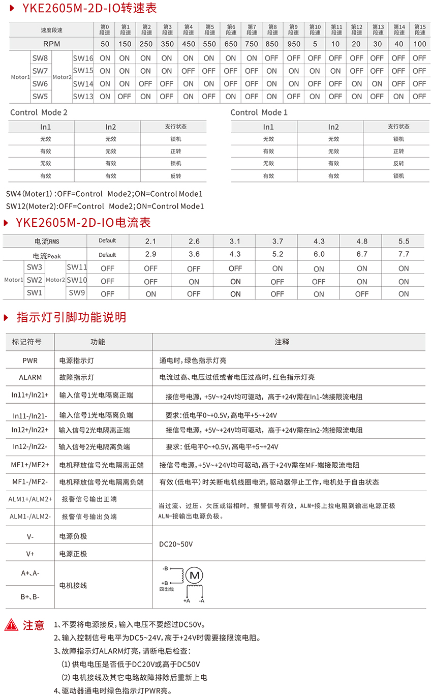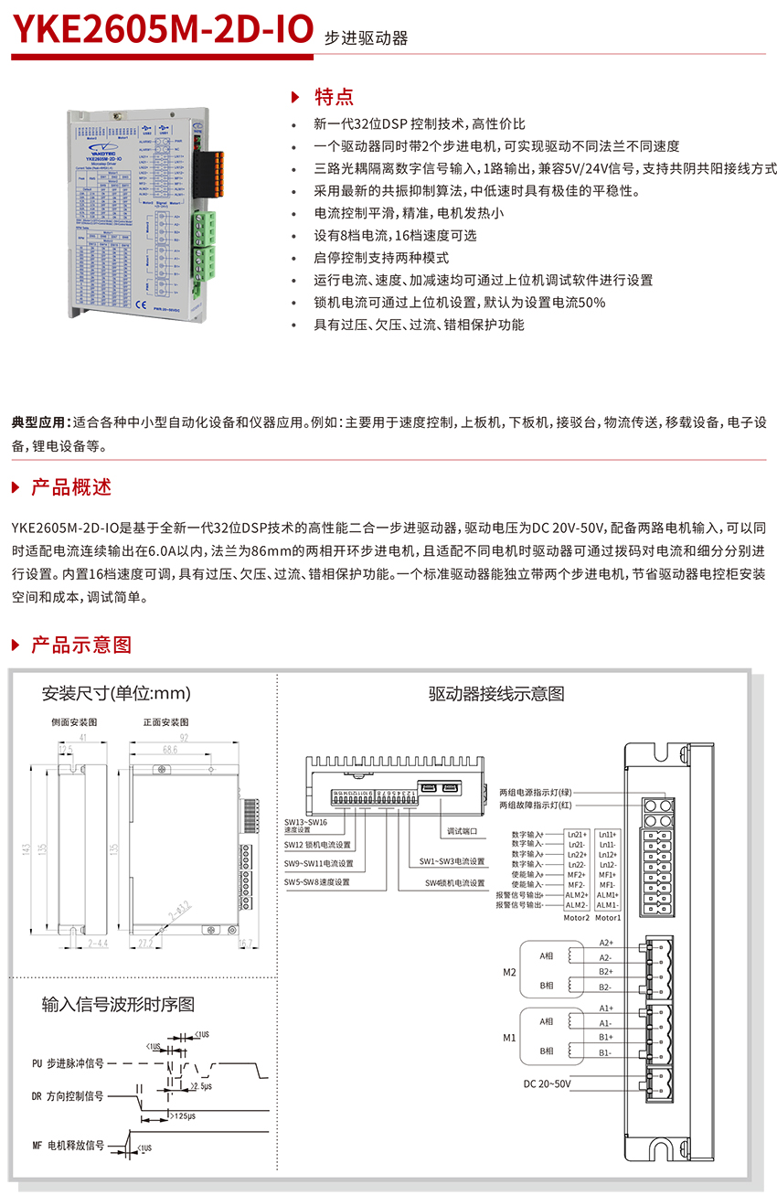 YKE2405M-2D-10是基于全新一代32位DSP技術的高性能二合一步進驅動器,驅動電壓為DC20-50V,配備兩路電機輸入,可以同時適配電流連續(xù)輸出在4.0A(有效值)以內(nèi),法蘭為42/57mm的兩相開環(huán)步進電機,且適配不同電機時驅動器可通過撥碼對電流和轉速進行分別設置。該驅動器控制模式為自發(fā)脈沖速度控制,4個撥碼可選16段轉速,也可通過上位機在速度范圍內(nèi)設置任意轉速;配備三路光電隔離數(shù)字輸入,一路報警輸出:在內(nèi)部采用類似伺服的控制原理,獨特的電路設計,優(yōu)越的軟件算法處理可以使電機低速運行平穩(wěn),精確的電流控制技術大大減小了電機發(fā)熱,在用戶期望低發(fā)熱、低噪聲、高平穩(wěn)性、高精度的設備中應用效果極佳。
